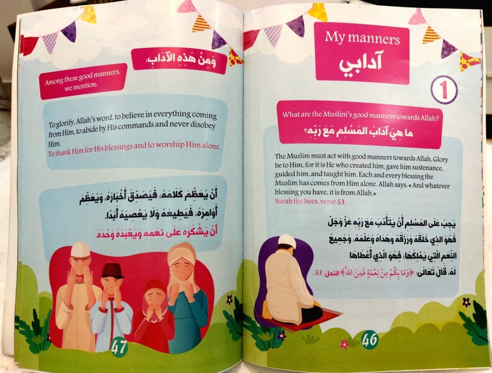 والكتاب باللغتين العربية والإنجليزية لتعليم الإسلام للأطفال وتقوية لغتهم الإنجليزية في نفس الوقت